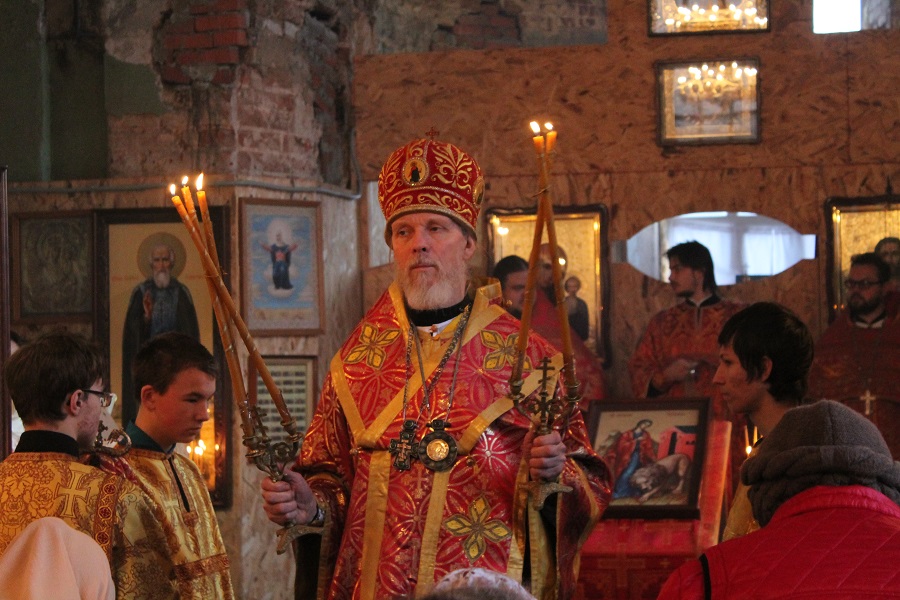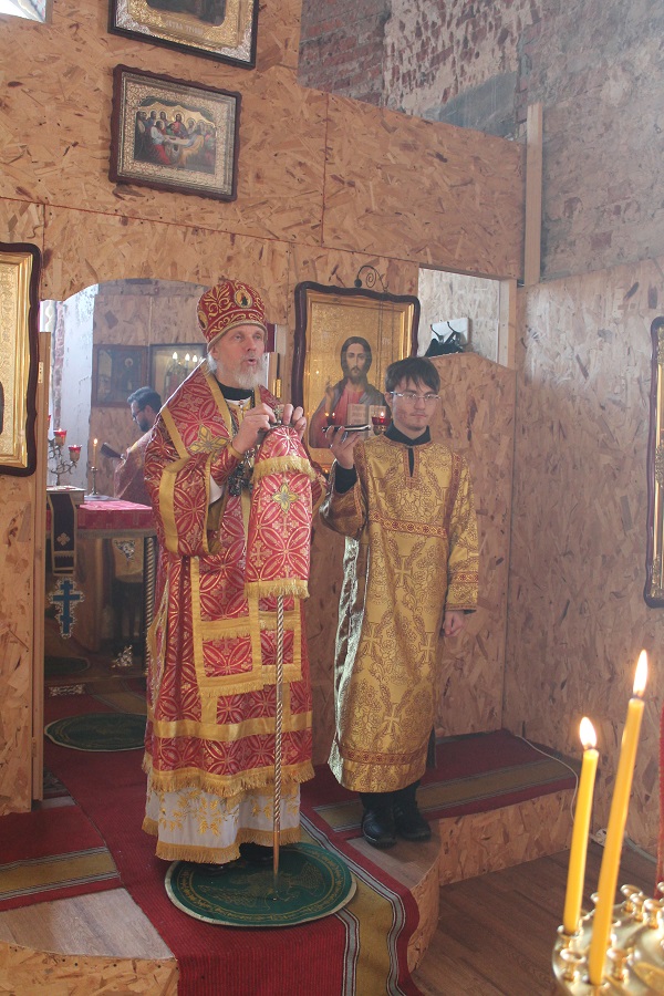 Владыке сослужили: настоятель храма протоиерей Павел Солдатов и благочинный 1-го округа иерей Александр Рябов при диаконе Евгении Васильеве.