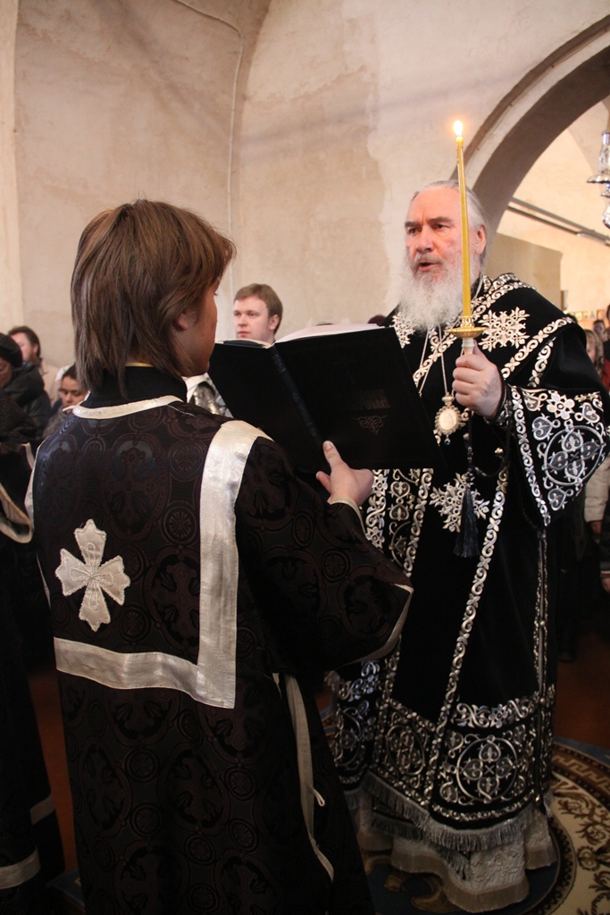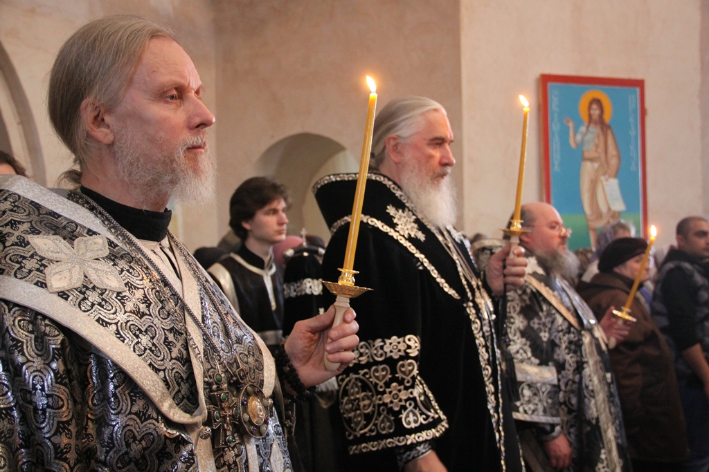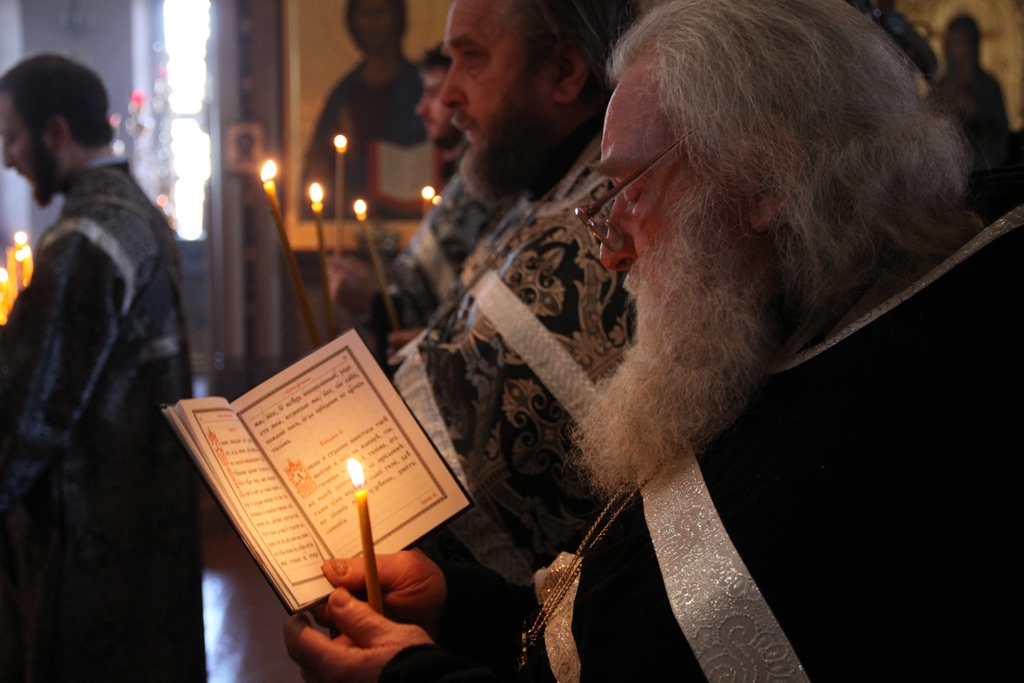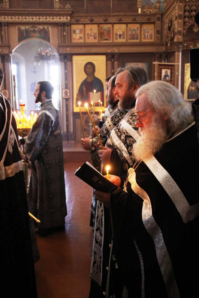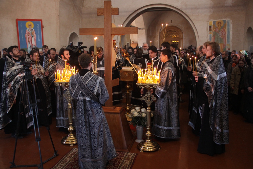 После прочтения на вечерни молитвы прп. Ефрема Сирина с великими поклонами митрополит Климент совершил каждение храма и возглавил чтение акафиста Страстям Христовым. Затем преосвященными владыками был прочитан отрывок Евангелия от Марка о последних событиях земной жизни Господа и Бога и Спаса нашего Иисуса Христа.