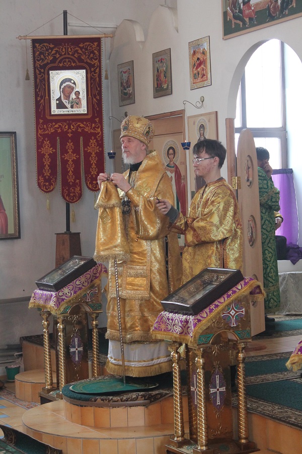 Утром Божественную литургию также совершил Высокопреосвященнейший владыка в сослужении настоятель собора иерея Александра Рябова, клирика собора иерея Михаила Камышева при диаконе Евгении Васильеве.