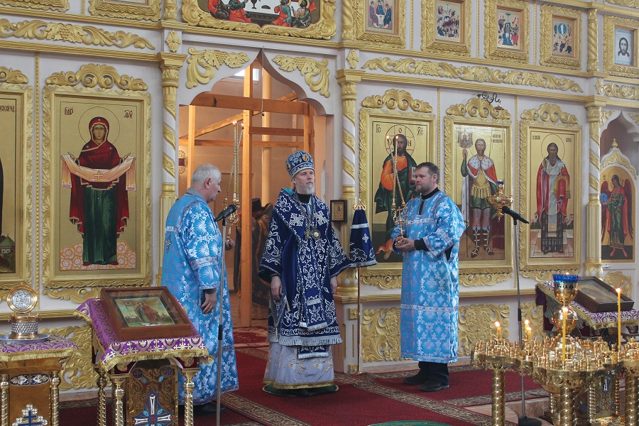Его Высокопреосвященству сослужили настоятель собора иерей Александр Рябов, клирики собора иерей Михаил Камышев, диакон Евгений Васильев и клирик Прихода блаженной Ксении Петербургской (ст. Фаянсовая) диакон Алексий Денисов.