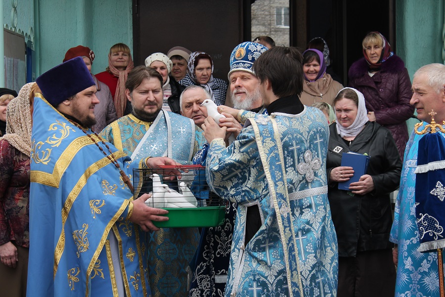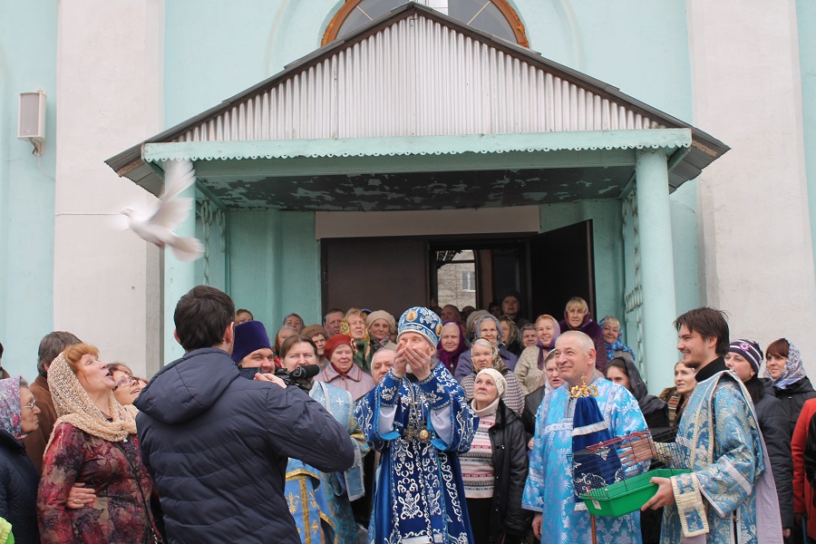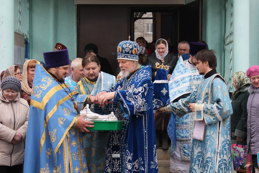 По окончании Литургии было совершено славление празднику Благовещения Пресвятой Богородицы после чего Высокопреосвященнейший Владыка вместе с духовенством собора выпустил в небо белых голубей.