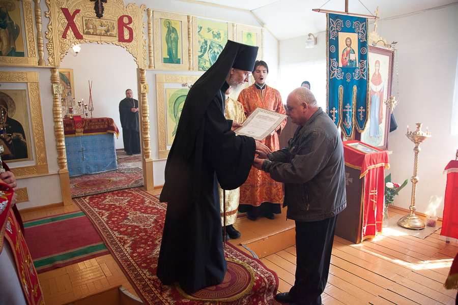 В завершении всего владыка преподнес Архиерейские грамоты активным прихожанам храма — Котовой Т. С. и Романову А. Н., и благотворителю храма — Демину Н. И.